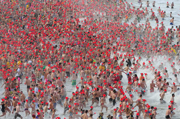 2. Голландские пловцы в ледяном Северном море в Шевенингене, Нидерланды. В Северной Америке клуб моржей помог популяризовать традицию купания в ледяных водах зимой. Бернарр Макфадден, основавший Клуб моржей Кони-Айленда в 1903 году, считал, что «купание в океане зимой поможет укрепить иммунитет и жизнеспособность»