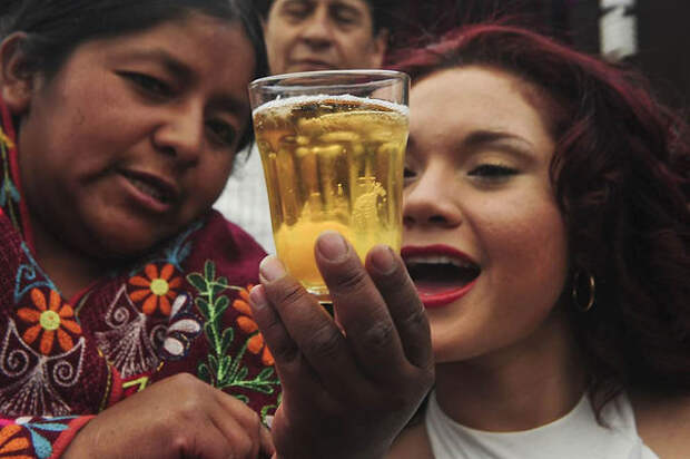 9. Девушка пытается прочесть послание из яичного желтка в стакане с пивом во время ритуала предсказания в Лиме, Перу.