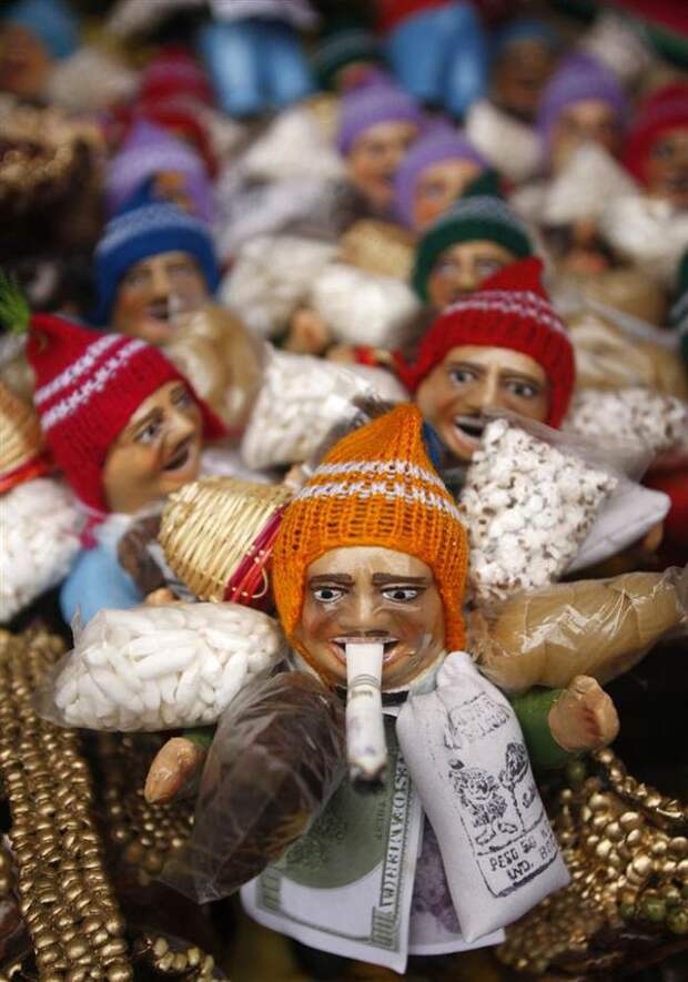 14. Куклы Экекоса, известного как бога изобилия, на рынке в Лиме. Каждый год люди приходят на традиционные рынки в поисках амулетов счастья и духовных ритуалов от шаманов, чтобы те благословили их перед Новым годом. Люди приносят миниатюрные версии вещей, которые они хотели бы иметь, а затем осчастливливают Экекоса, например, дав ему покурить.