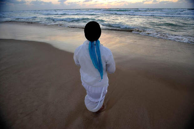 25. Еврейка практикует Ташлих в первый день еврейского нового года Рош Ха-Шана, в прибрежном израильском городе Ашдод. Ташлих – это ритуал долгого стояния, который проводят в полдень в новый год. По традиции, в море нужно бросать кусочки хлеба или другую еду, чтобы они унесли с собой грехи прошлого года.