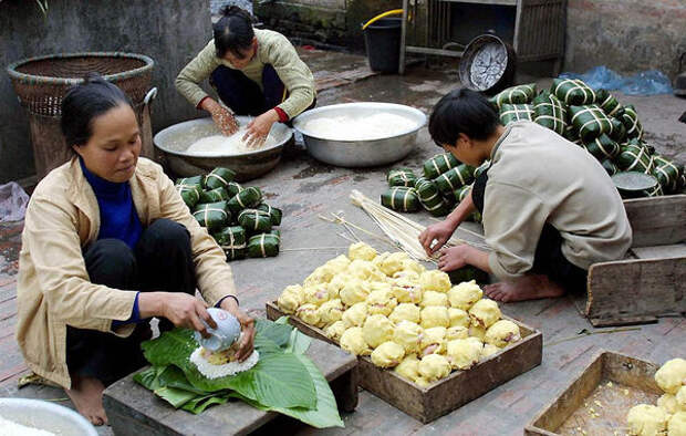 22. Родственники делают традиционные новогодние рисовые лепешки бан чунг во дворе дома в пригороде Ханоя, Вьетнам. Бан чунг – деликатес из липкого риса, свинины и зеленых бобов, завернутых в листья «донга». Блюдо готовят 10 часов. Еда – важный аспект новогодних традиций для всех культур и стран. Свинина и ветчина очень популярны на Филиппинах, в Австрии, Германии и Швеции.
