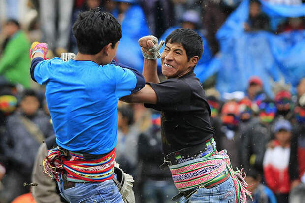 16. Андские мужчины дерутся во время традиционного фестиваля Таканакуй в провинции Чумбивилкас в Куско, Перу. Таканакуй, что переводится как «когда закипает кровь» с языка кечуа, - ежегодное и древнее празднование, произошедшее от доиспанской культуры Чанка, которое дает сотням жителей андских деревушек решить проблемы личного характера, чести и частной собственности путем силы кулаков.