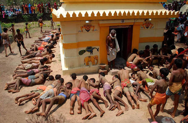 13. Индийцы катаются вокруг храма, преподнося традиционные молитвы богу Шива во время ритуала в рамках фестиваля, который совпадает с Новым годом Орийя в Мендхасале, Индия. Фестиваль Данда длится 13 дней. В Новый год также празднуют приход весны. В индуизме нет одного общего празднования Нового года. В каждом регионе свои обычаи и даты.