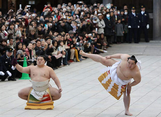 15. Чемпион сумо Асасоруи исполняет ритуал очищения у храма Меидзи Дзингу в Токио. Борцы сумо отмечают Новый год ритуалом перед хамом Меидзи Дзингу.