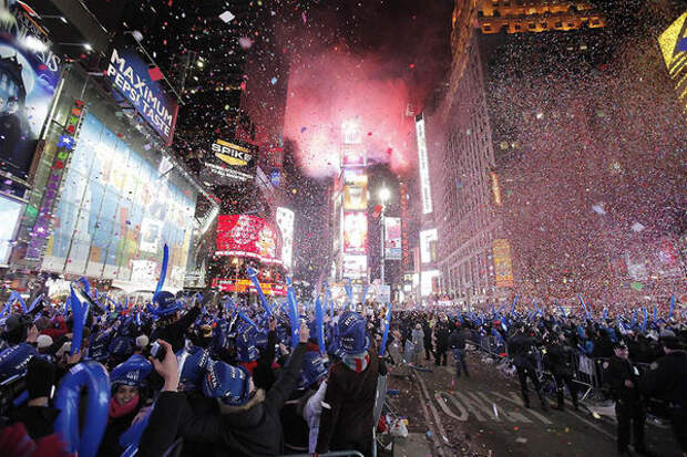 7. Толпа орет, конфетти падает, на Таймс-Сквер начинаются гуляния. Первый новогодний шар в Нью-Йорке на Таймс-Сквер появился в 1907 году. Тогда в нем было сто 25-ваттных лампочек 1,5 метра в диаметре, он весил 300 кг и был сделан из железа и дерева.