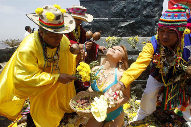 3. Девушка держит подношения из фруктов, пока шаманы проводят ритуал на удачу в новом году в Лиме, Перу. В Перу желтый цвет приносит удачу, и люди часто надевают желтые купальники на удачу. Шаманы со всей страны приходят на ярмарки и празднества, чтобы совершить различные ритуалы – осыпать людей желтыми цветами или посадить на тело морскую свинку.