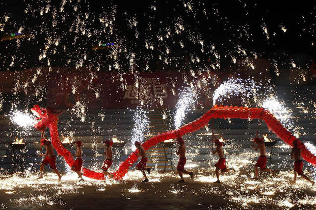 5. Артисты исполняют танец огненного дракона на храмовой ярмарке в честь Китайского Нового года в Пекине. Традиционный танец дракона сопровождается громкими ударами барабана и тарелок, которые прогоняют злых духов в новом году. Празднества проходят за 15 дней до Нового года по лунному календарю, который выпадает на новолуние и означает конец зимы.