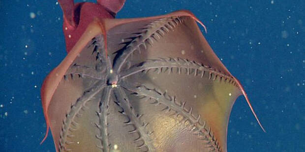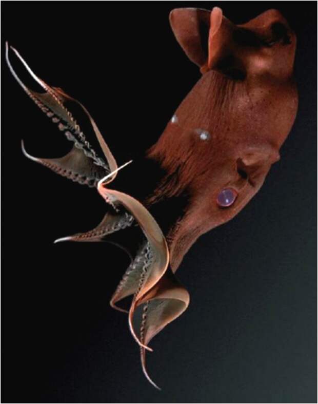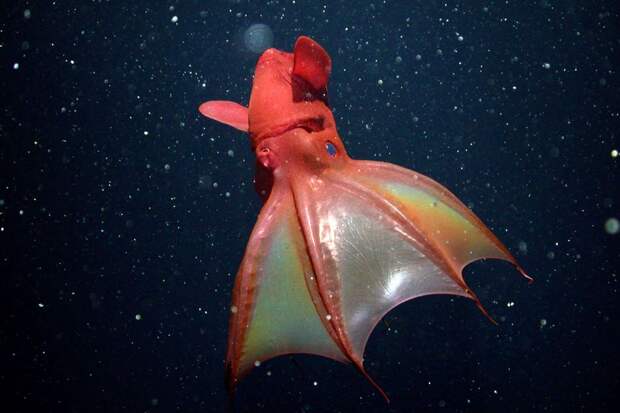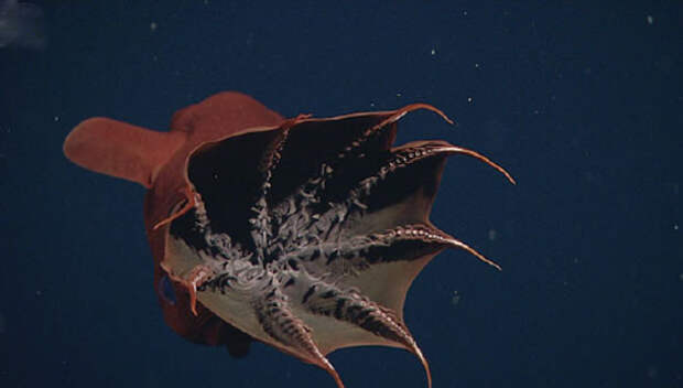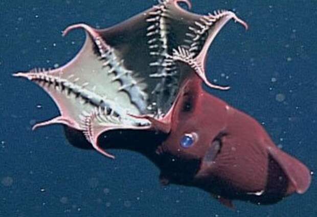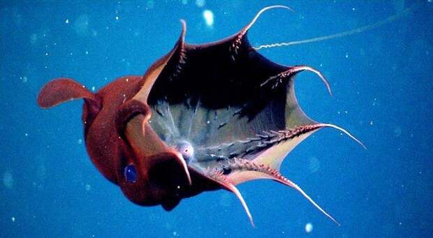 Поистине устрашающее название – адский вампир, получил маленький головоногий моллюск, обитающий на больших океанских глубинах в тропической и умеренной климатических зонах. Несмотря на его очевидную схожесть с осьминогом и кальмаром, этого моллюска ученые выделили в отдельный отряд Vampyromorphida (лат.